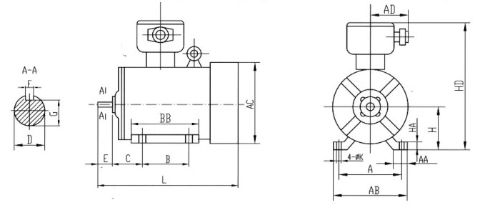 YBX3防爆電機是對YBX3系列高效率隔爆型三相異步電動機的簡稱,是在YB3防爆電機的基礎上進行改進的防爆電機,相比YB3更加高效節(jié)能,能夠取代YB3防爆電機的適用性。效率符合GB18613-2012《中小型三相異步電動機能效限定值及能效等級》中的2級能效,且具有性能優(yōu)良,使用安全可靠,振動、噪聲比同類產(chǎn)品降的特點,符合環(huán)保要求。本系列電動機防爆性能符合GB3836.1-2010《爆炸性環(huán)境第1部分:設備通用要求》和GB3836.2-2010《爆炸性環(huán)境第2部分:由隔爆外殼“d”保護的設備》的規(guī)定,制成隔爆型。防爆標志為Ex dⅡA T4 Gb、Ex dⅡB T4 Gb,Ex dⅡC T4 Gb,適用于有爆炸性氣體混合物存在的場所。 Ex dⅡA T4 Gb適用于工廠用IIA類,溫度組別為T1、T2、T3和T4組爆炸性氣體混合物存在的環(huán)境。 Ex dⅡB T4 Gb適用于工廠用IIB類,溫度組別為T1、T2、T3和T4組爆炸性氣體混合物存在的環(huán)境。 Ex d ⅡC T4 Gb 適用于工廠用IIC 類,溫度組別為T1、T2、T3 和T4 組爆炸性氣體混合物存在的環(huán)境。 在YBX3 基本系列電動機基礎上,也可制成YBX3-W 戶外型、YBX3-TH 濕熱帶型、YBX3-THW戶外濕熱帶型、YBX3-TA 干熱帶型、YBX3-TAW 戶外干熱帶型、YBX3-T 熱帶型、YBX3-TW 戶外熱帶型及YBX3-WF1 戶外中等防腐蝕型等氣候環(huán)境條件。