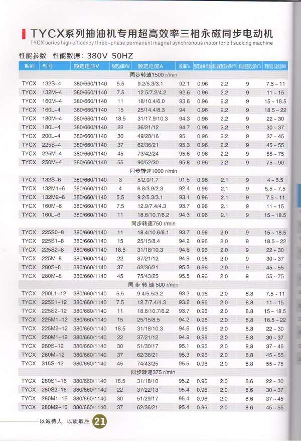 TYCX系列抽油機用高效率三相永磁同步電動機,該系列產品的效率指標符合GB30253—2013《永磁同步電動機能效限定值及能效等級》的1級標準,達到同等產品的國家先進水平。